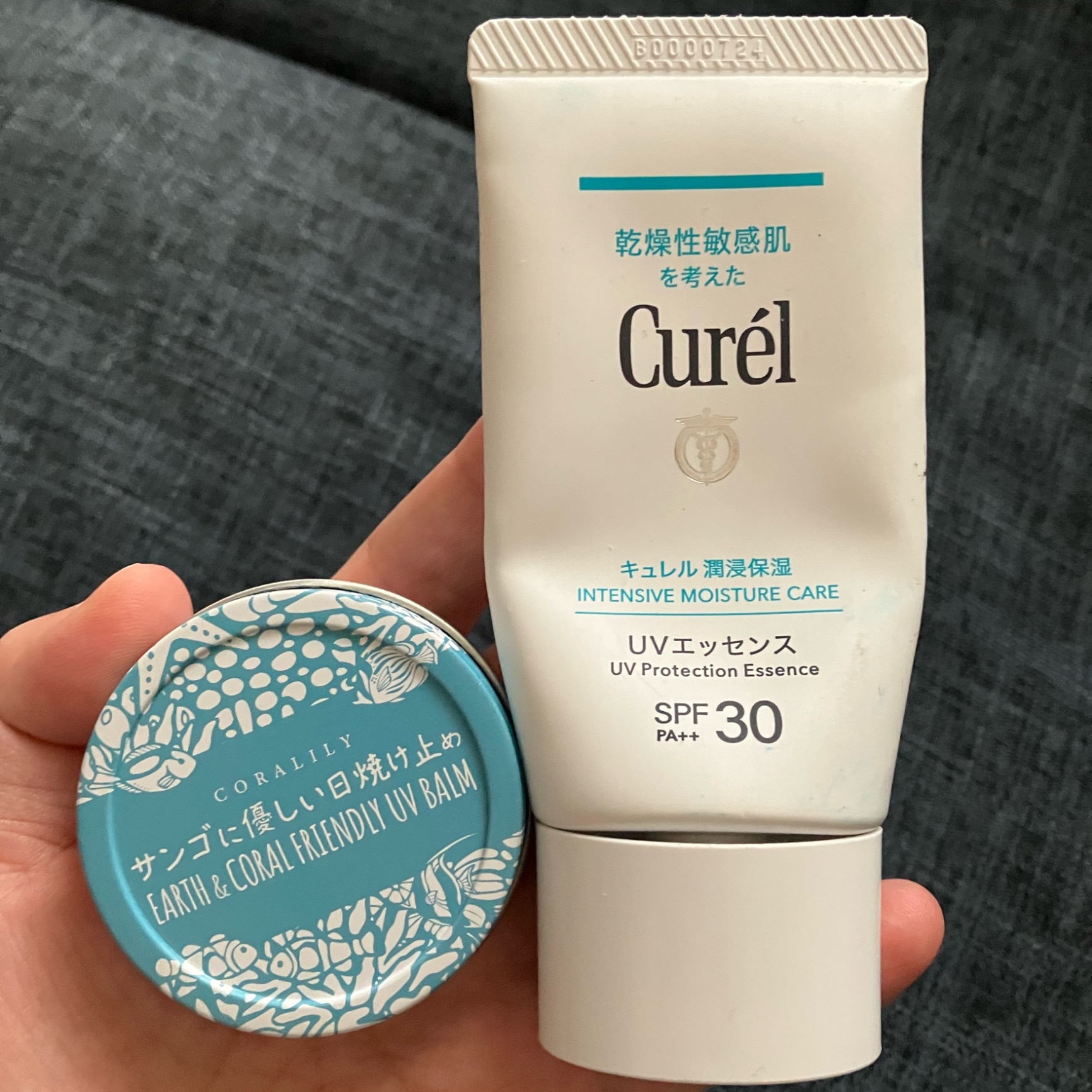 日焼け止めはキュレルとサンゴに優しい日焼け止め。どちらも体に優しい成分なのでお気に入り。ただ、サンゴの方は汗で効果が流れて塗り直しが必要なので顔にはあんまりおすすめできない…。