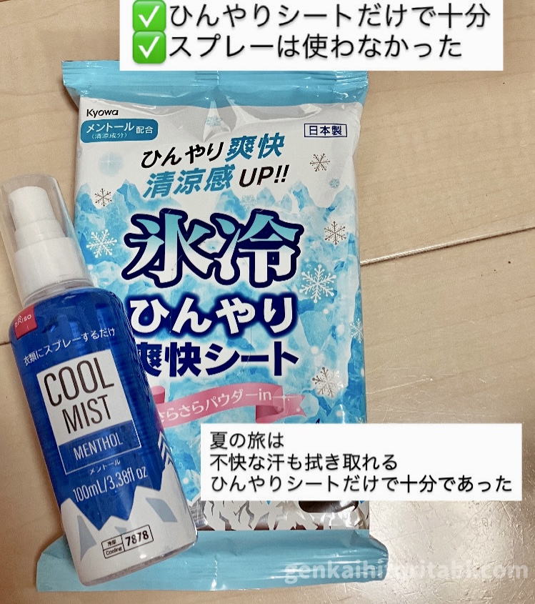 熱中症対策でひんやりシリーズを持って行くと思うのですが、その際は『シートタイプ一択』です。スプレーは結局使わなかった。シートは不快な汗を拭きながら、ひんやりできるのでシートだけ持っていけば◎。